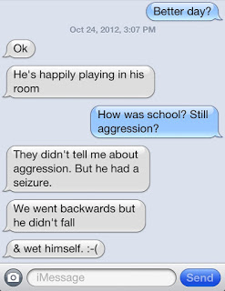 And I fall into the same trap with my after school check in texts. I text the wife everyday around 3pm all hopeful that things are on an upswing and I can tell when I ask “How’s Kyle?” And I get back a quick “ok” text that there is a “…BUT…” text coming and I sit there waiting for the punch in the gut.