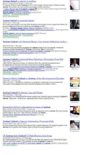 But look at that picture above. That’s a google news search for the term “autism linked” and just in the past week or so, besides maternal obesity autism has also been linked to mom’s diabetes, inherited gene mutations from the dads, both parents age & weight, superior processing skills, and… wait for it… High Fructose Corn Syrup.