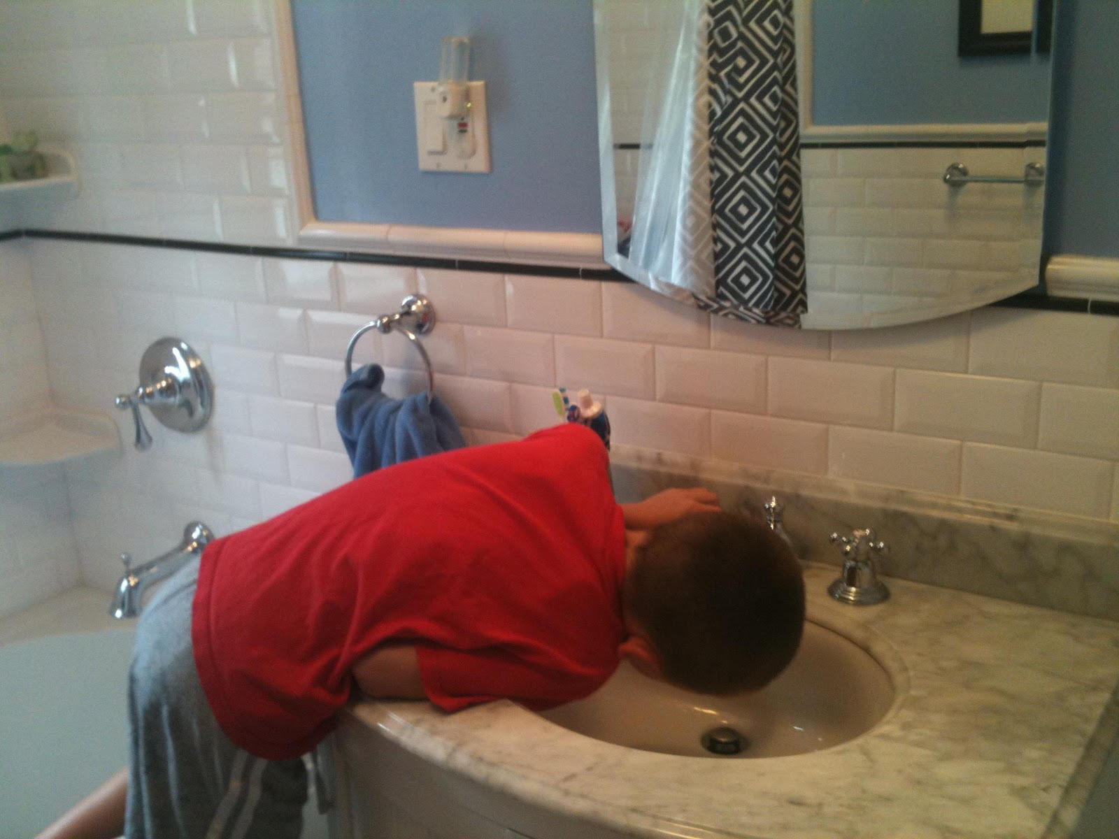 and drinking out of the hot water, stomping around throwing books, breathing heavy/ holding his breath, hands in his pants, climbing on the couch/staircase, jumping on the sofa, stage diving from the ottoman to the sofa, etc, etc.