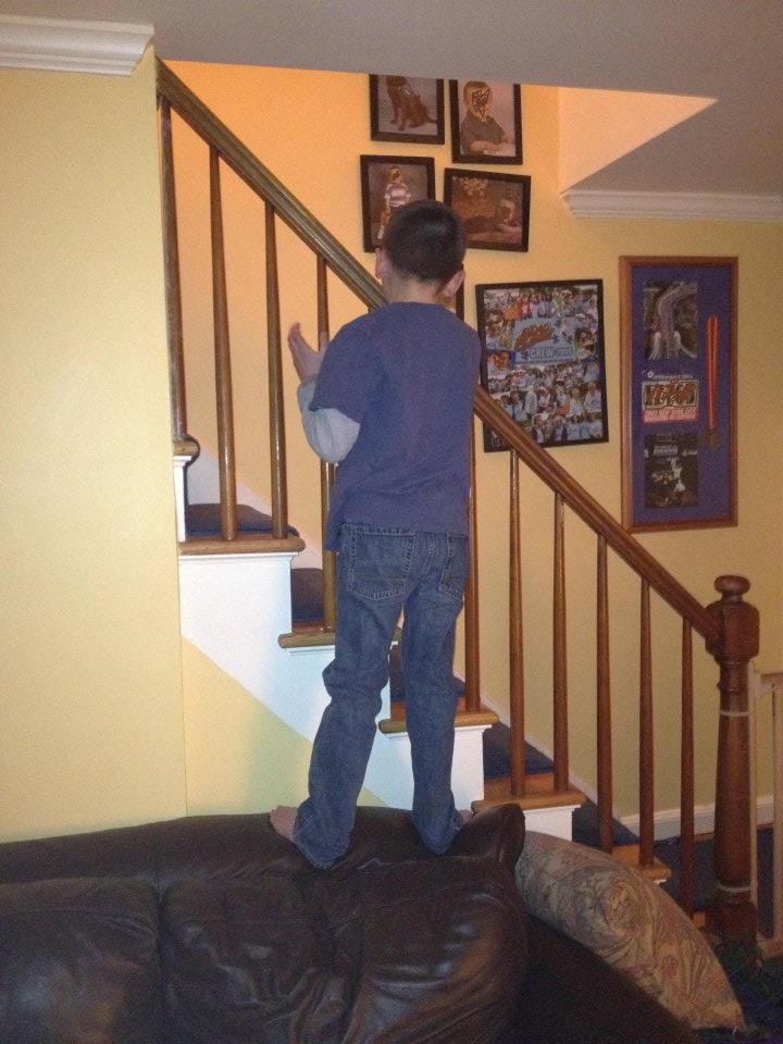 and drinking out of the hot water, stomping around throwing books, breathing heavy/ holding his breath, hands in his pants, climbing on the couch/staircase, jumping on the sofa, stage diving from the ottoman to the sofa, etc, etc.   Â