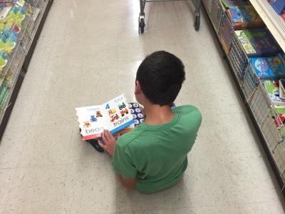 Here’s him in the bookstore. We’re trying to be more age appropriate with him lately but he still gravitates towards his old toddler favorites…